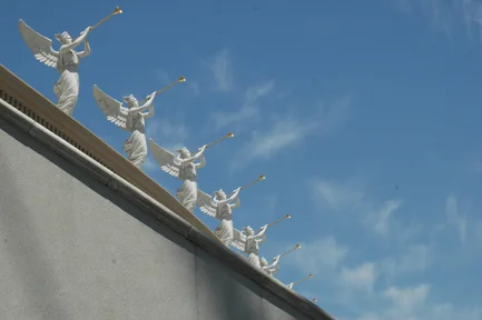Notice below the obvious repetition of the statues is complemented by the similarity in color and form of the cloud's wing shapes. The wings are repeated again in the clouds.