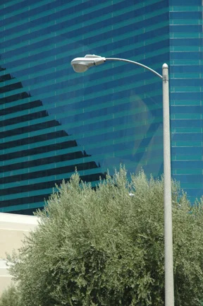 Contrast does not have to be as simple as dark and light. In the image below, the leaves of the tree contrast the stark gray metal of the utility pole and the shine of the blue glass. There is also the contrast of organic vs. geometric. What other kinds of contrast can you find?